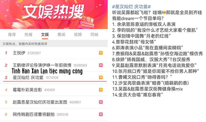 Hiện tại, hashtag #Tiệc mừng công Tinh Hán Xán Lạn# đang chiếm giữ vị trí no.3 hot search bảng giải trí Weibo chứng tỏ sức nóng liên quan đến bộ phim vẫn chưa hạ nhiệt. Khởi chiếu từ ngày 5/7, khán giả không mấy mặn mà với Tinh Hán Xán Lạn nhưng lại không kịp “quay xe” ngay từ những tập đầu tiên. Diễn xuất trọn vẹn của dàn diễn viên từ chính đến phụ và đáng chú ý nhất chính là phản ứng hóa học bùng nổ giữa nam nữ chính.